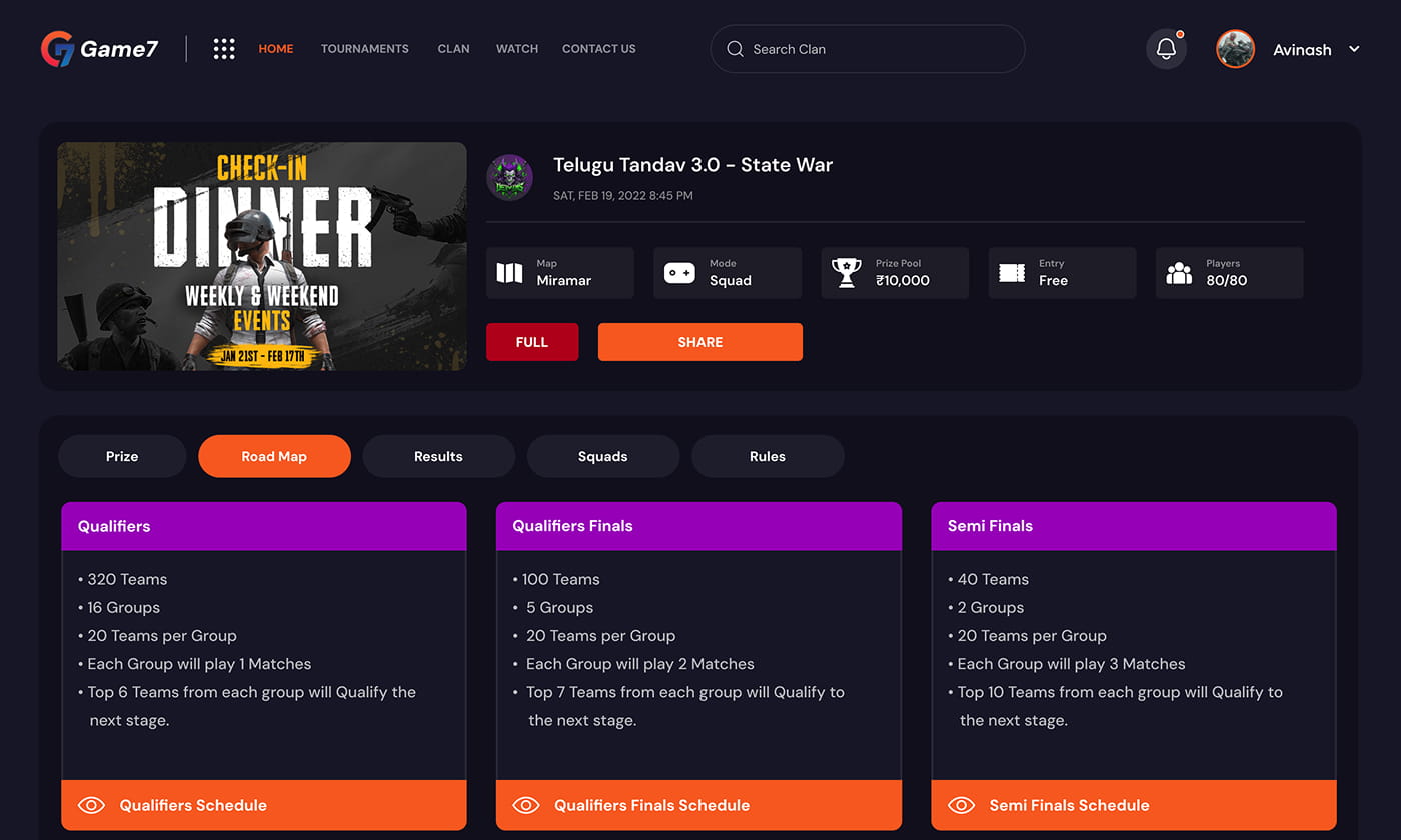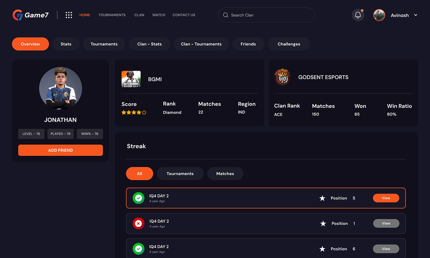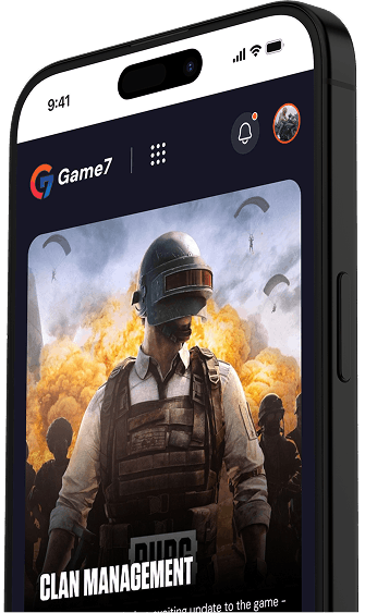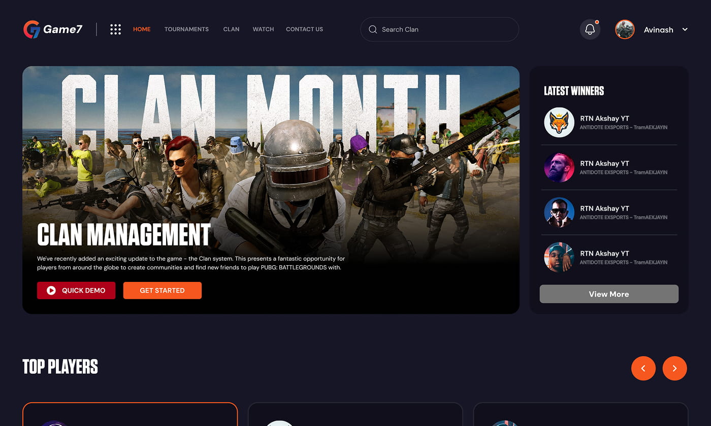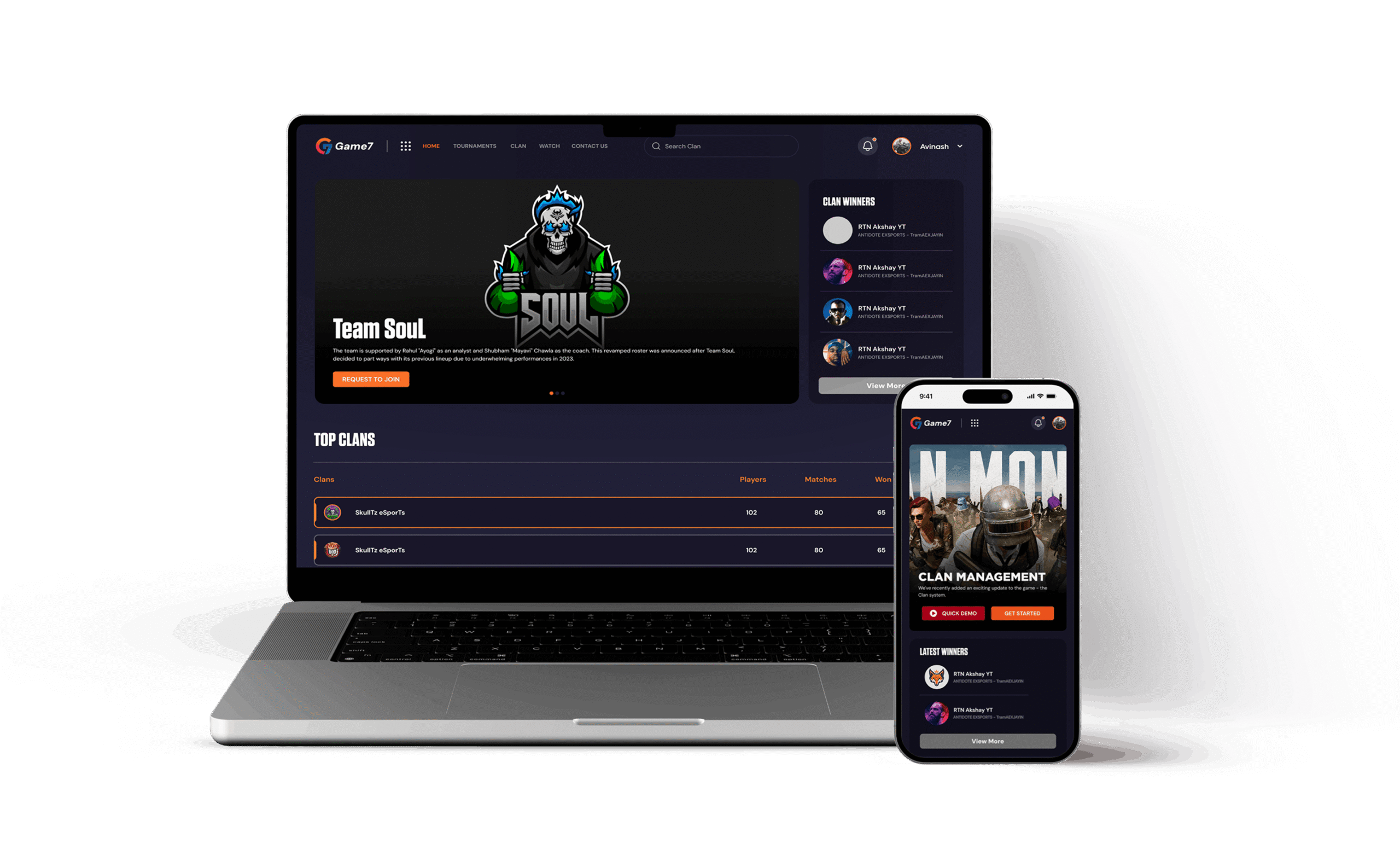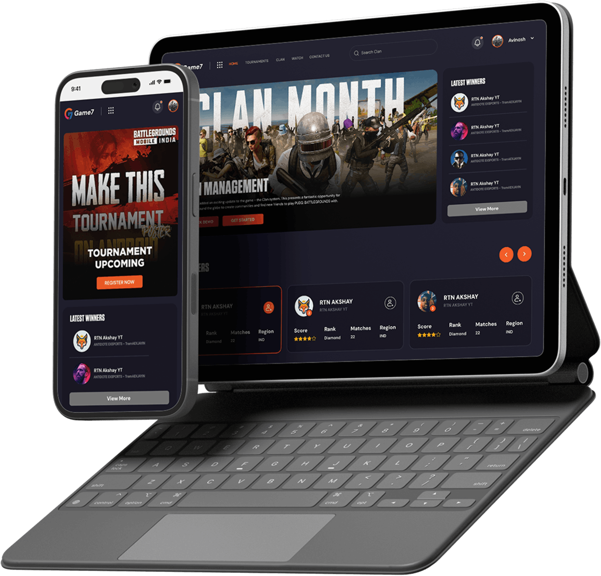 Game7 is an online gaming platform built around competitive play and community, spanning tournament discovery and participation, player profiles and stats, clans and squads, match pages, and video/content screens.