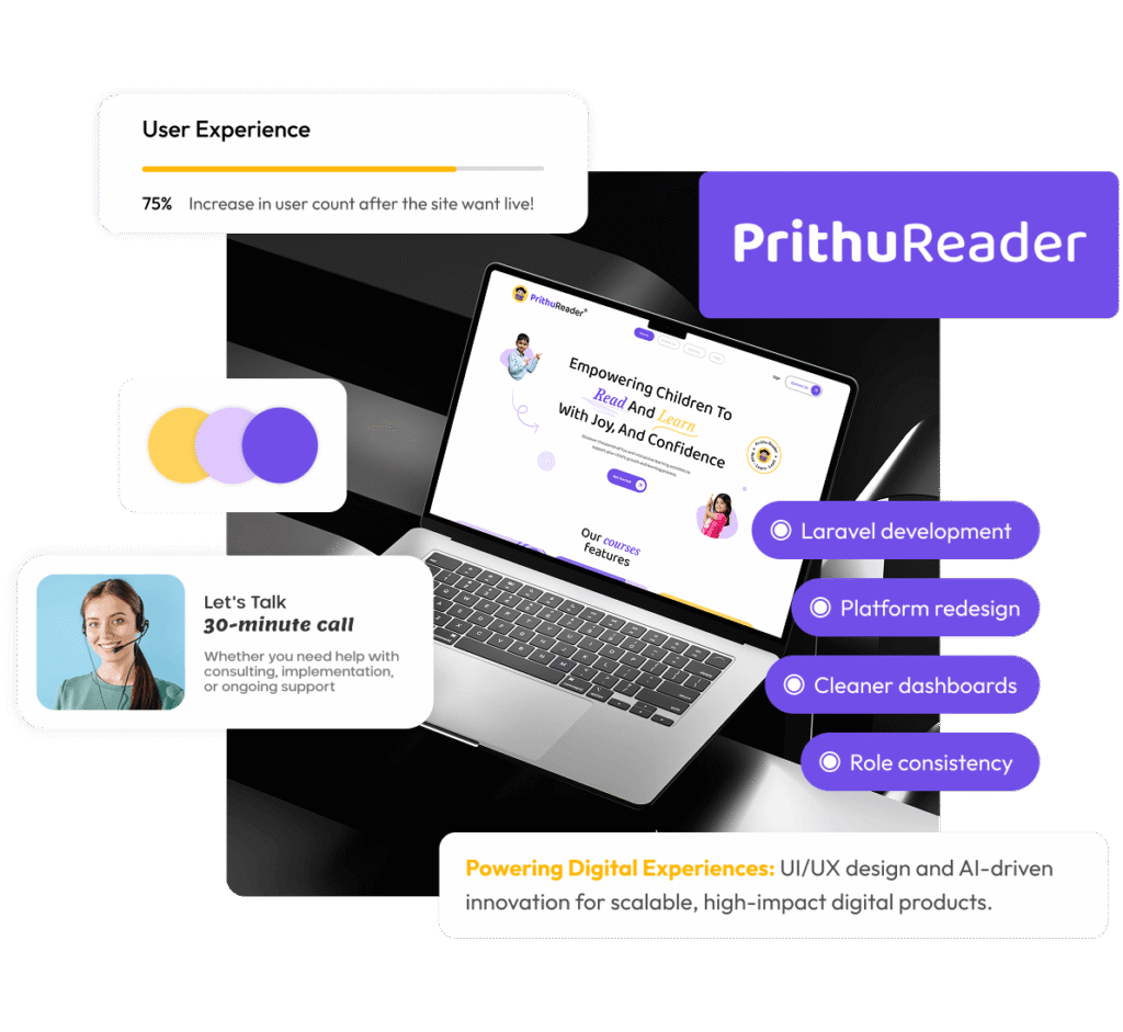 PrithuReader is a learning platform with multiple user roles and a large operational backend. Beyond the public site, the product includes dedicated portals for parents, kids, teachers and admins - each with different workflows, permissions and daily tasks.